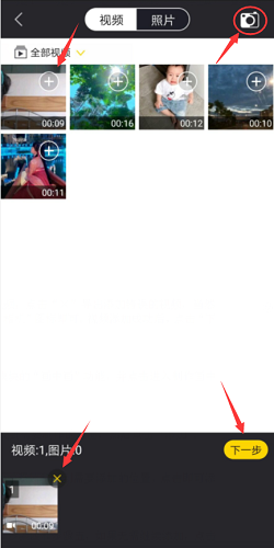 点击“+”导入需要的视频,点击“×”导出添加错误的视频,也可以点击“相机”图标现场拍摄。视频导入成功后点击“下一步”。