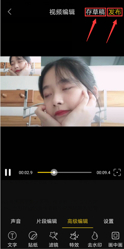 返回视频编辑页面后,可点击“存草稿”将视频保存至本地,也可以点击“发布”快速分享给好友。