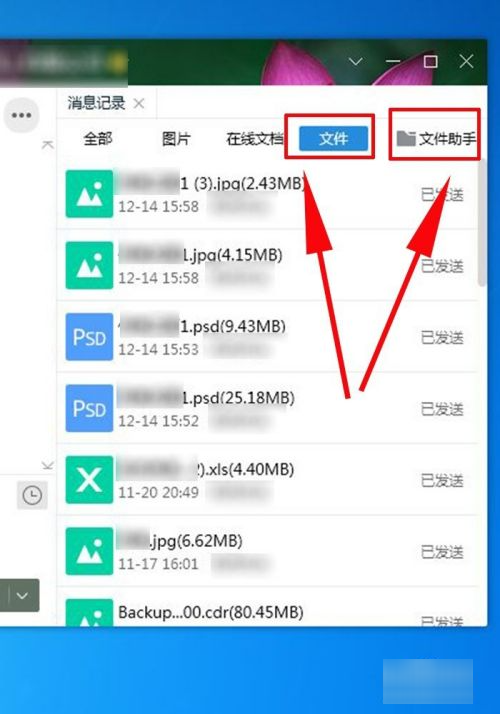 5、进入文件助手页面,点击【已接收文件】,选择合适时间,来源和类型找到需要恢复的文件。