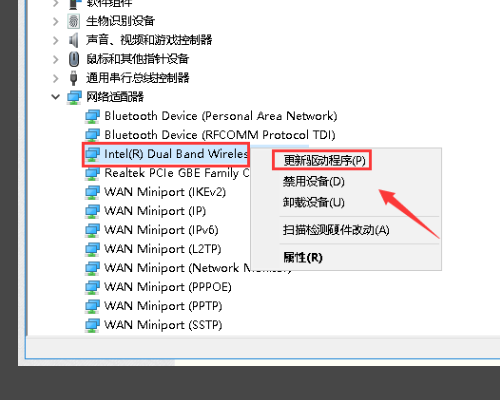 4、进入网络适配器,找到你的无线网卡,右键单击选更新驱动程序,如下图所示。