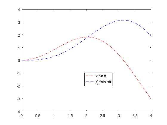 legend('x*sinx','\int_0^x{t*sint}dt')