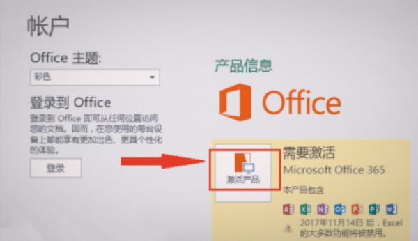 1、打开office,进入后在左下角找到“账户”按钮并点击,在右侧可以看到office是需要激活的,点击“激活产品”按钮。