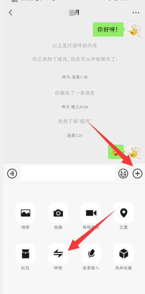 1、打开你朋友的聊天框,点开右下角的“+”号,然后选择“转账”。