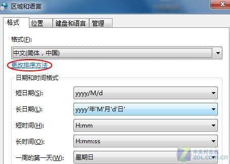 在控制面板中,双击“区域和言”,在的打开的对话框中,单击“更改排序方法”(如图1)。