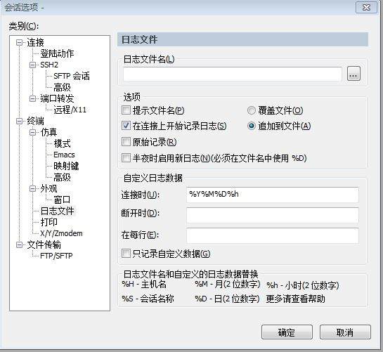 在菜单里选择“选项”——“全局选项” 然后选择常规——默认会话——编辑默认设置 然后选择日志文件 在日志文件名里填入你想保存的日志路径名加日志文件名 这里为了可以每个会话都打成一个日志,可以采用支持的参数 %H 主机名 %S 会话名 %Y 年份 %M 月份 %D 日 %h 小时 %m 分钟 %s 秒 例如我填写的E:\Development\SecureCRT\Logs\%H\%Y-%M-%D_%h%m%s.log 就是会保持在E:\Development\SecureCRT\Logs\目录下,路径里也可以使用参数 \%H\这样设置可以把同一个主机的日志到到一个文件夹里,文件夹名就是主机名,没securecrt保存大量数据