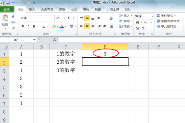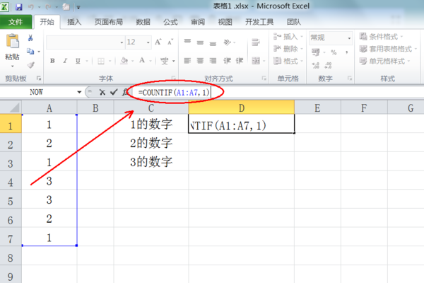 2、通过复制步骤1的公式,更改第二个参数数字如=COUNTIF(A1:A7,2),即可统计出其他相应数字出现的次数。