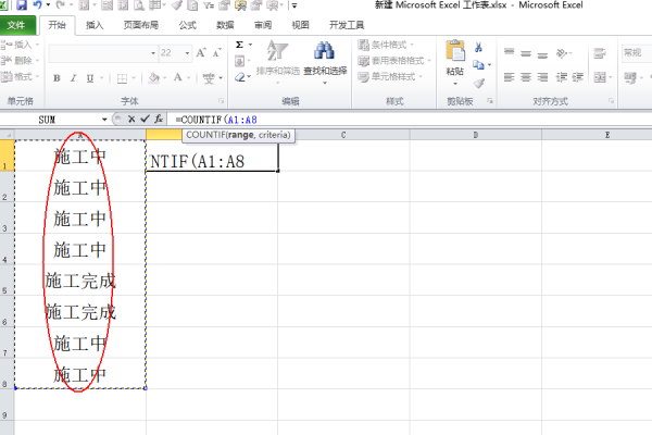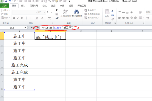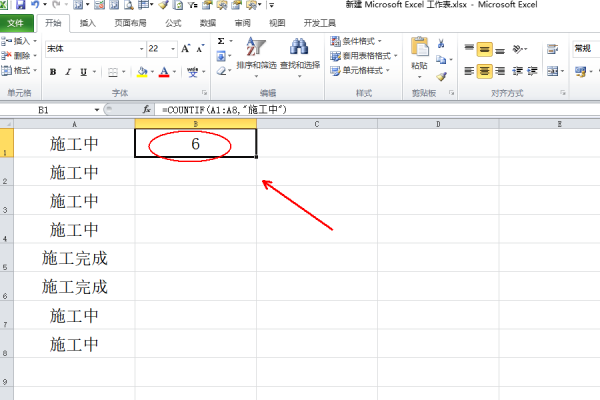 2、继续输入需要统计的值如“施工中”并输入右括号),回车完成函数编辑即可。