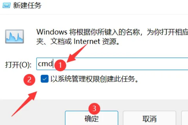 4、输入cmd,同时勾选以管理员身份运行,然后点击确定,如下图所示。