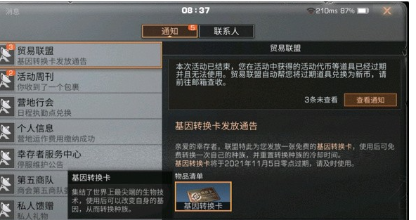 明日之后中的基因转换卡是可以让玩家免费转换种族的道具,但是这个道具将会于2021年11月5日零点过期,所以玩家最好早些用掉。玩家在邮件箱里领取基因转换卡就可以在背包里直接使用了。
