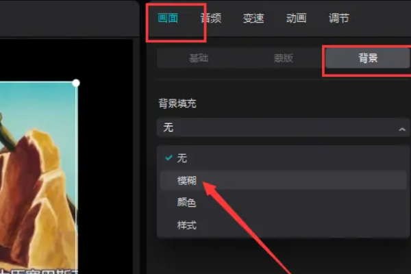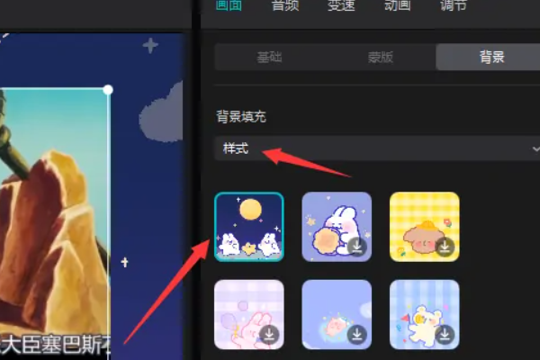 3、选中视频轨道中的视频片段,在右侧的属性界面中,通过切换到画面背景选项卡,并从背景列表中选择一种样式。