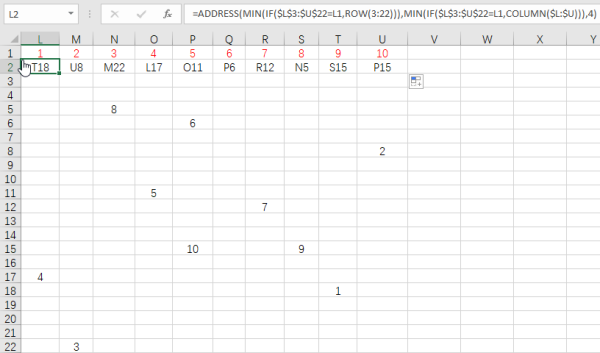 =ADDRESS(MIN(IF($L$3:$U$22=L1,ROW(3:22))),MIN(IF($L$3:$U$22=L1,COLUMN($L:$U))),4)