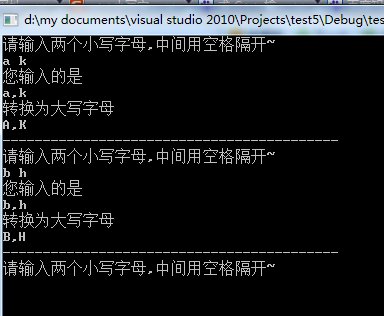 cout<<"请输入两个小写字母,中间用空格隔开~"< cin>>a>>b; if(a>='a' && a<='z' && b>='a' && b<='z') { cout<<"您输入的是"< cout< cout<<"转换为大写字母"< cout<<(char)(a-32)<<","<<(char)(b-32)< cout<<"------------------------------------------"< } else cout<<"输入有误"< } system("pause"); return 0; } 运行 望采纳 相关文章 Java程序设计语言是什么意思?Java是由SunMicrosystems公司于1995年推出的一门面向对象程序设计语言。2010年Oracle公司收购SunMicrosystems,之后由Oracle公司负责Java的维护和 软件设计模式鸭子模拟器假设我们需要设计出各种各样的鸭子,一边游泳戏水, 一边呱呱叫。很明显这时我们需要设计了一个鸭子超类(Superclass),并让各种鸭子继承此超类。 public abs 我想学习编程需要购买那些书籍?书籍整理如下:C++开发1.《C++ Primer》:全面学习C++的必备书籍2.《Thinking in C++》:了解C++背后的一些机bai制3.《深度探索C++对象模型》:深入了 孩子学习少儿编程,会影响文化课成绩吗?孩子学习少儿编程,从某种程度上会影响文化课成绩,孩子学习少儿编程会从两个方向发展,一个是能更好的促进文化课成绩,通过学习少儿编程,锻炼少 初学STM32的入门方法有哪些?我的一些体会:\x0d\x0a\x0d\x0a首先,关于STM32入门,这个可能需要的是指导教程和技术论文。说实话STM32并不难,因为你可以把它当做单片机来用,至少不会 vc++6.0执行源文件是出现“执行CL.EXE时出错”是怎么回事?“CL.exe”是VC使用真正的编译器(编译程序),其路径在“VC根目 录 /VC98/Bin”下面,你可以到相应的路径下找到这个应用程 用vb编程要求输入一个两位数,输出:个位和十位的和OptionExplicit 数控冲床编程方法?1.分析零件图纸:任何一个零件无论怎样加工,首先应对其零件图进行分析。全面了解被加工零件的几何形状、尺寸大小、零件材料及热处理情况,为工艺处理做好准备。2 大一C语言编程题?车票根据题意两两站点连线生成,金额和数量分别用随机数。数据存储:站点,车票,用户分别为3个结构体,用于对应数据库。