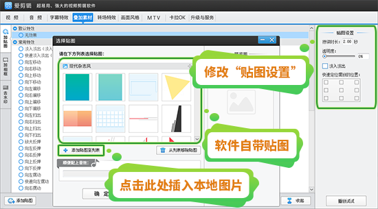 在“叠加素材”-“加贴图”面板下,双击右侧的视频预览区,在弹出框中选择贴图,将其插入到视频中合适的位置,并在右侧修改持续时长等即可。