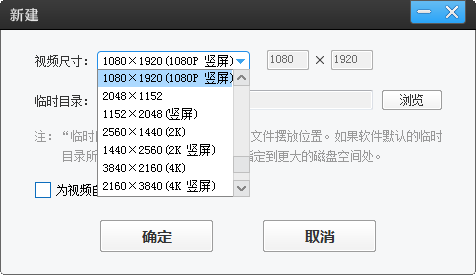 在电脑端打开爱剪辑,弹出“新建”对话框,在“视频尺寸”下拉列表中,选择竖屏的分辨率即可,如:1080P竖屏。