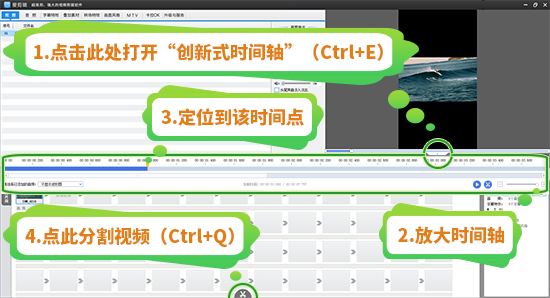 鼠标点击右侧视频预览区下方,向下凸起的箭头,调出“创新式时间轴”(快捷键:Ctrl+E),放大时间轴,鼠标定位到分割的时间点,点击界面下方“超级剪刀手”(快捷键:Ctrl+Q),一键分割视频。
