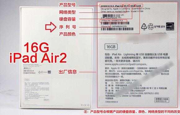 在新购买的iPad包装盒背面上部的铭牌中,我们可以看到序列号标注,如下图所示。