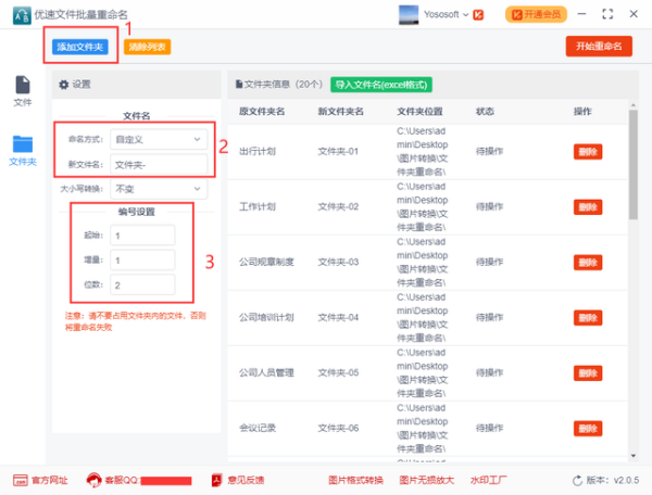 步骤2,点击右上角蓝色按钮,将需要重命名的文件夹全部添加到软件中。如下图所示:命名方式选择“自定义”,然后在新文件名右边输入新文件夹名称,然后在下方进行编号设置(起始是第一个文件夹的编号;增量是下一个文件夹编号增加的值;位数是编号一共几位的意思)。