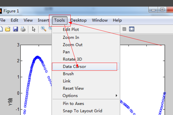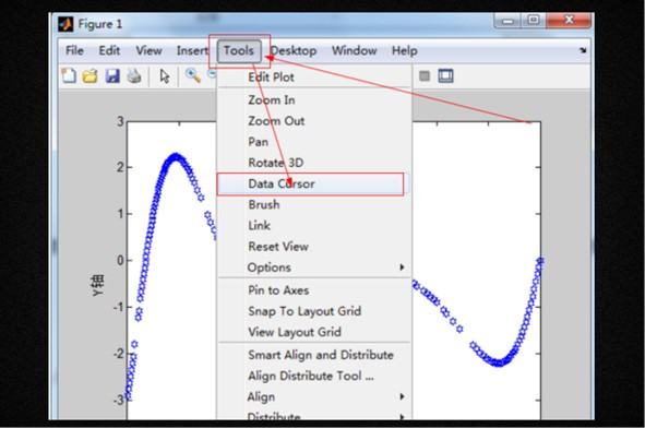 2、第二步,执行完上面的操作之后,在“tools”选项中单击“Data Cursor”按钮,见下图,转到下面的步骤。