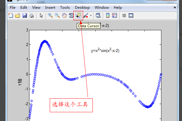 1、第一步,选择菜单栏的“Data Cursor”选项,然后在要查看其坐标值的数据点上点击鼠标的左键,见下图,转到下面的步骤。
