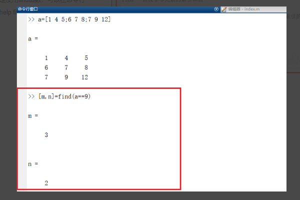 3、输入[m,n]=find(a==9),找到a数组等于9的坐标,如下图所示: