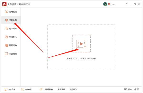 一、打开视频剪辑软件后,在左侧选择“视频分割”功能,接着再点击添加文件将需要剪辑的视频上传到软件中;