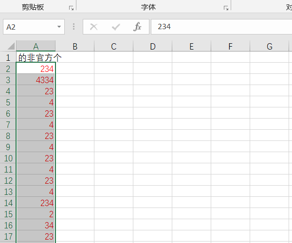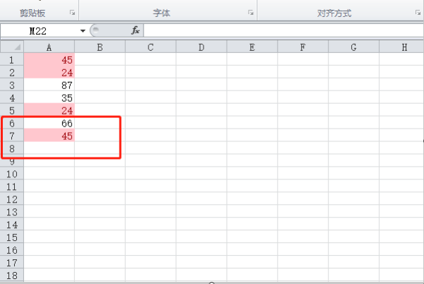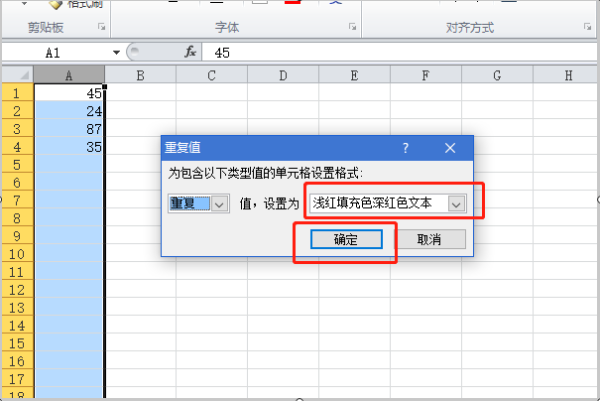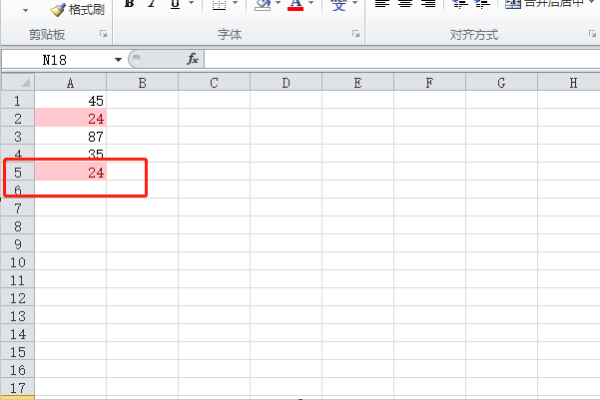 4、这时再在A列里输入重复的数字,那个字体就会变红,如输入数字24,因为重复了,列中两个24都会显示红色;
