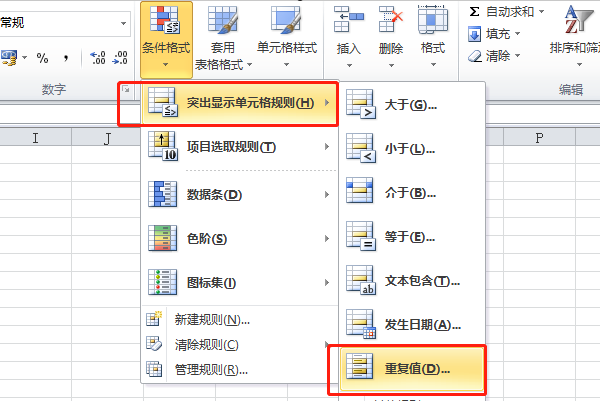 2、然后在页面上方找到“条件格式”,点击,在弹出框里选择突出显示单元格规则,再在弹出框里选择重复值;