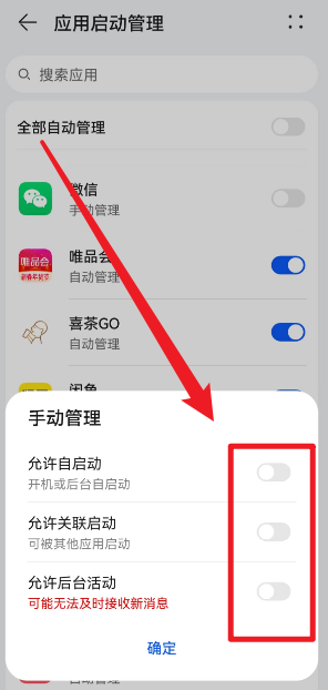 3、在应用启动管理页我们找到【微信】点击后边的按钮