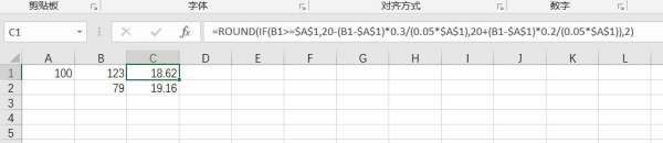 ==ROUND(IF(B1>=$A$1,20-(B1-$A$1)*0.3/(0.05*$A$1),20+(B1-$A$1)*0.2/(0.05*$A$1)),2)