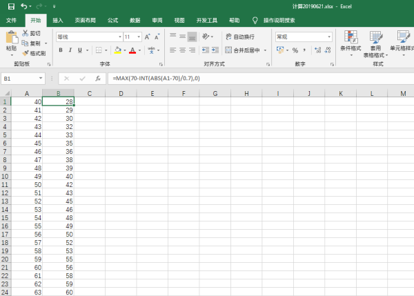 =MAX(70-INT(ABS(A1-70)/0.7),0)