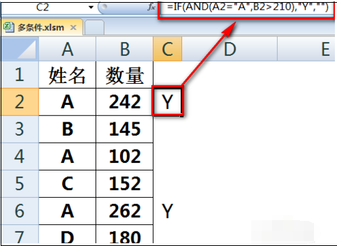 3、在C2输入公式:=IF(AND(A2="A",B2>210),"Y","")