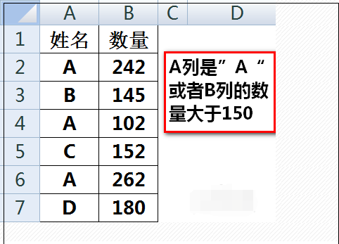 4、然后,利用OR()函数来说明只要满足多个条件中的一个或一个以上条件。举例:如果A列的文本是“A”或者B列的数据大于150,则在C列标注“Y”。