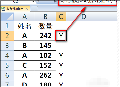 5、在C2单元格输入公式:=IF(OR(A2="A",B2>150),"Y","")