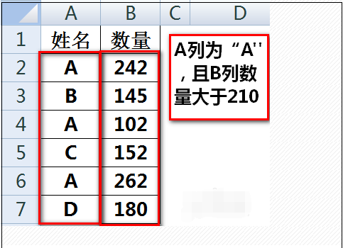 2、首先,利用AND()函数来说明同时满足多个条件。举例:如果A列的文本是“A”并且B列的数据大于210,则在C列标注“Y”。