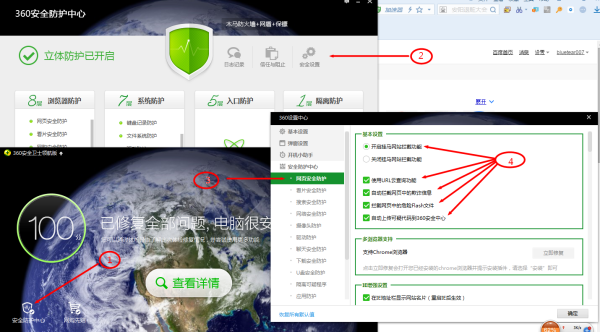 安全防护中心→安全设置→网页安全防护→开启所有网页防护项→确定