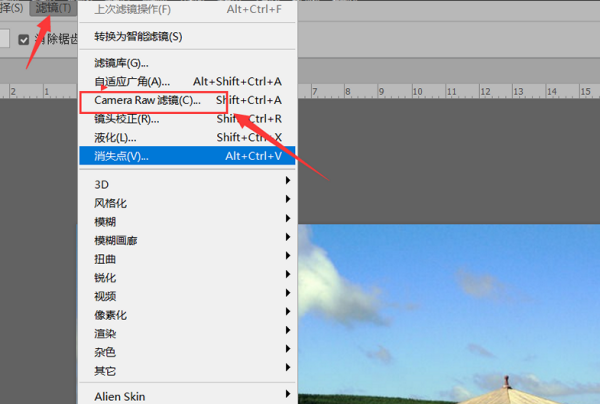 7、如果我们用的ps是ps cc版本以上,就不用那么麻烦了,直接在滤镜下就能打开Camera RAW界面了。