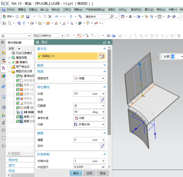 6、为测试是否转换钣金成功,可以使用弯边功能来进行检测,测试结果达到要求;
