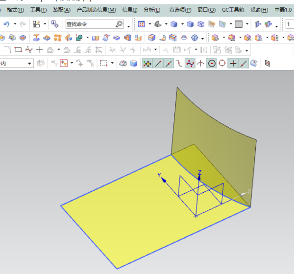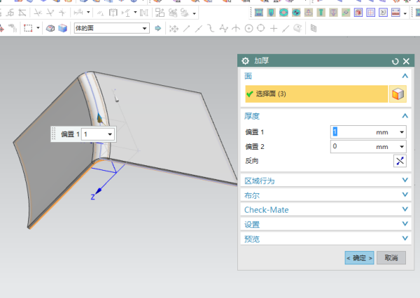 4、选中曲面,使用加厚命令,把上一步创建的曲面变成实体,钣金零件的厚度大多是1mm.