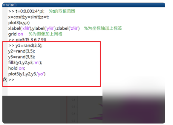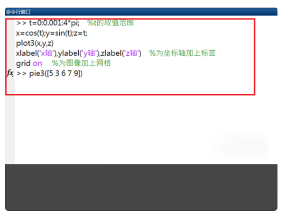 3、接下来绘制三维饼图,输入“pie3([5 3 6 7 9])”。