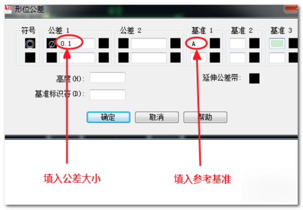 6、填入公差尺寸数字以及基准符号。填写完毕后,点击确定,几何公差的框格就会出现在光标附近跟随光标移动。