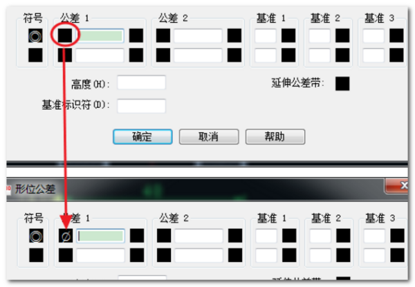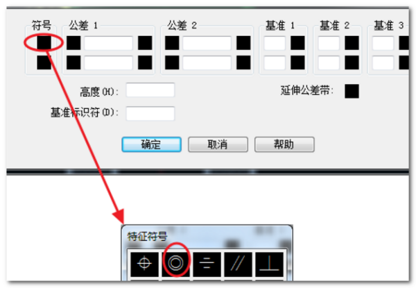 4、点击“符号”下面的黑框,选择几何公差(形位公差)的类别,即选择需要标注的几何公差符号。