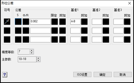 3、选择符号、输入标注内容。如上图所示,在国标设置状态,用户先选择形位公差项目,再选择主参数范围、精度等级,程序可以自动查询自带的形位公差字典库中得到符合国标标准的形位公差值,并显示在形位公差值的输入区域。如上图所示,选择圆跳动、主参数30-50、精度等级2后,形位公差值区自动显示0.002。输入完成,点击“确定”按钮;