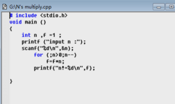2、然后在man函数中输入代码。这里所谓的n的阶乘,就是从 1 开始乘以比前一个数大 1 的数,一直乘到 n,在for循环中不断计算f和n相乘,每轮计算完就n就减1,直到n=1结束计算。最后打印出计算结果程序就编写完成了: