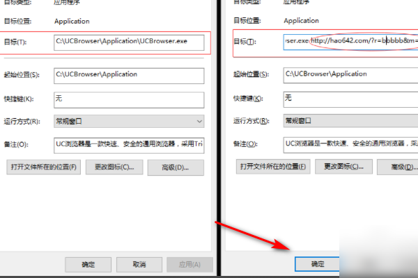 4、这通常适用于三向浏览器(uc,google等),在这里,以UC浏览器为例,在桌面上找到UC浏览器快捷方式,右键单击 - 属性,在这里,您可以在浏览器快捷方式中看到目标栏,并且快捷方式(2)显然已添加到URL中。删除此URL并单击“确定”。