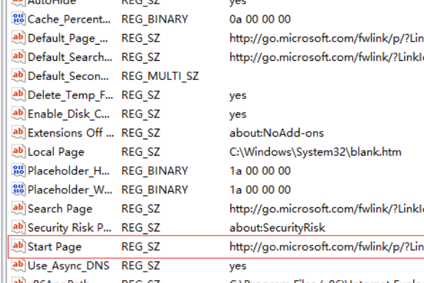 在窗口右侧查找:检查网站是否已被篡改(默认为“空”或微软的官方网站)。如果收到篡改,请将起始页的值更改为about:blank或自定义网站。