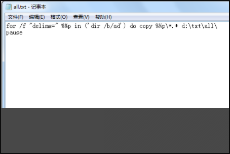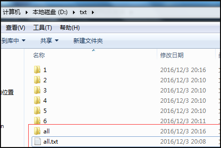 1、首先将想要合并的文件夹装到一个文件夹中。然后在该文件夹中新建一个文件夹和txt文件,均命名为all。