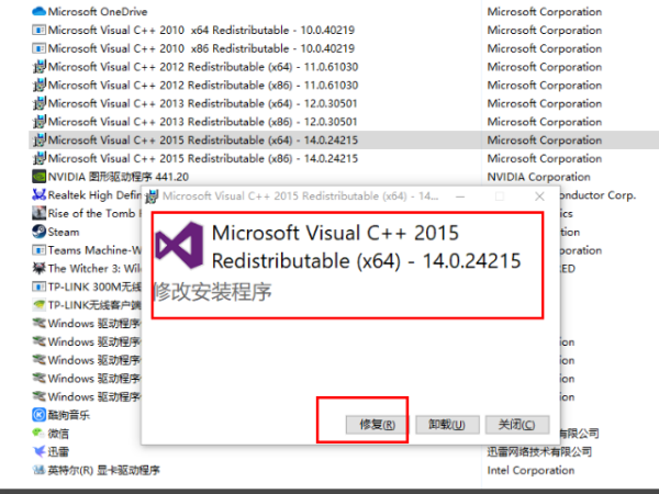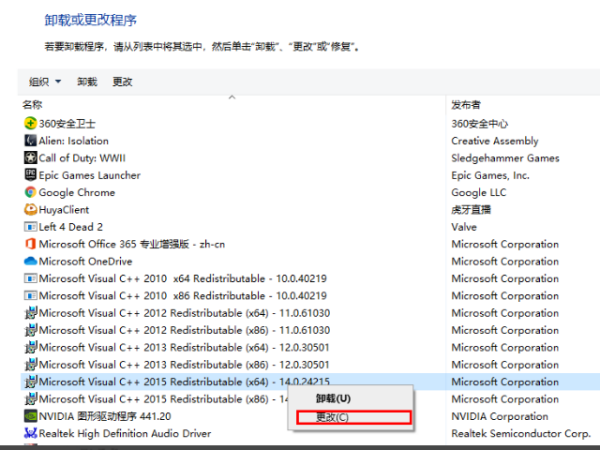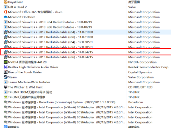 2、找到程序 Microsoft Visual C++ 2015 Redistributable(x64)-14.0.24215。