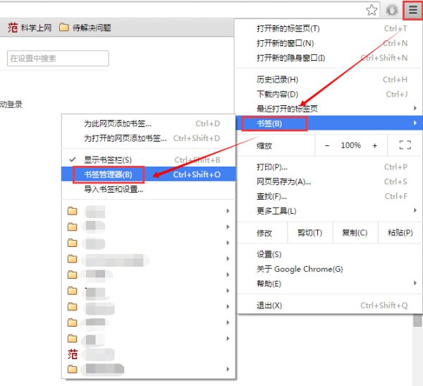1、打开chrome浏览器,如图进入书签管理。