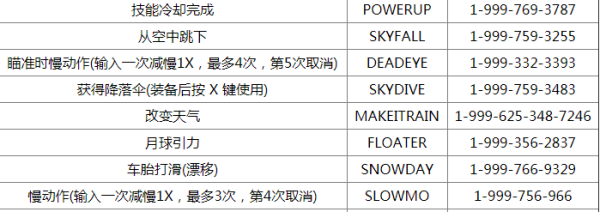 第一种:在游戏中按 “~” 键,输入秘籍后按回车! 第二种:拨打电话号码(类似GTA IV) 第三种:直接输入代码(类似罪恶都市) 秘籍名称 代码 电话号码 醉酒模式 LIQUOR 1-999-547-861 爆炸+近战攻击 HOTHANDS 1-999-4684-2637 快速奔跑 CATCHME 1-999-228-8463 燃烧+武器弹药 INCENDIARY 1-999-462-363-4279 无敌5分钟 PAINKILLER 1-999-724-654-5537 加满血与护甲 TURTLE 1-999-887-853 提升通缉等级 FUGITIVE 1-999-3844-8483泰拉瑞亚怎么输入代码?