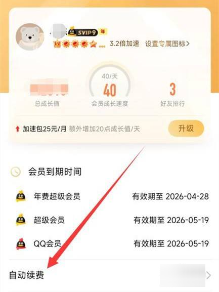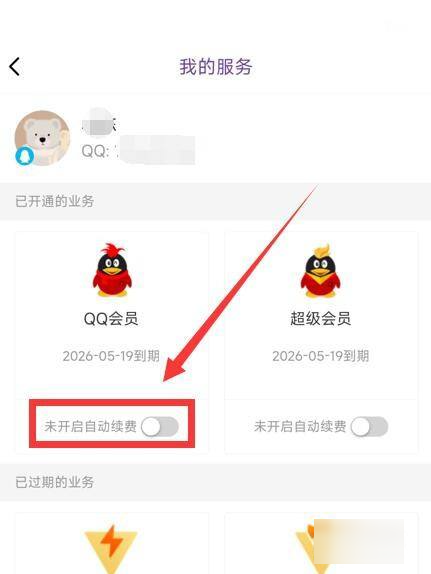 4. 如图,在打开的页面,我们可以看到会员到期日期,然后找到下方的“自动续费”选项,打开。